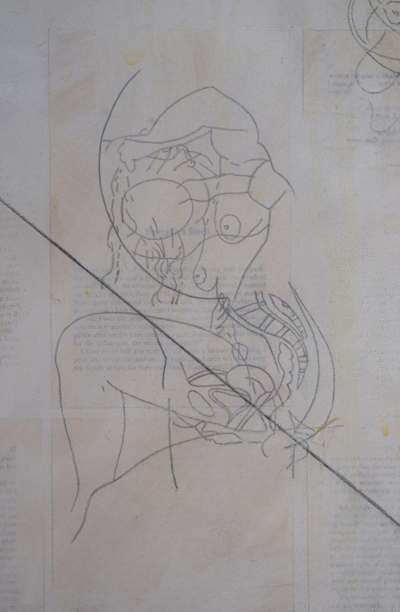 • oil, acrylic and pencil, collage, boxed illustrated copy of The Story of the Eye on canvas